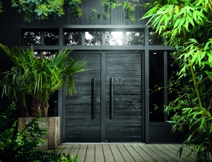 Holzfinish: Shou Sugi Ban in Kombination mit gebürsteten Edelstahlbeblankungen und integrierter Knaufgarnitur.